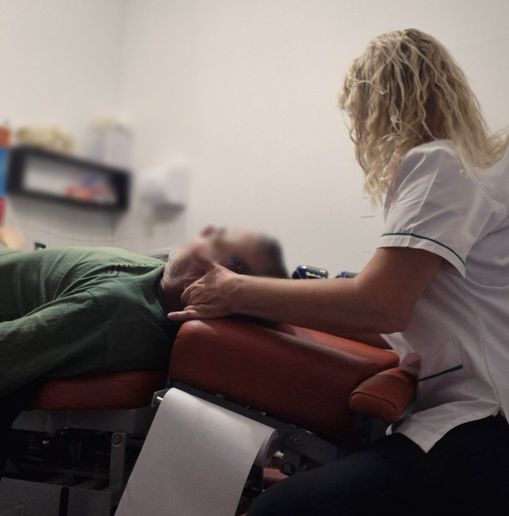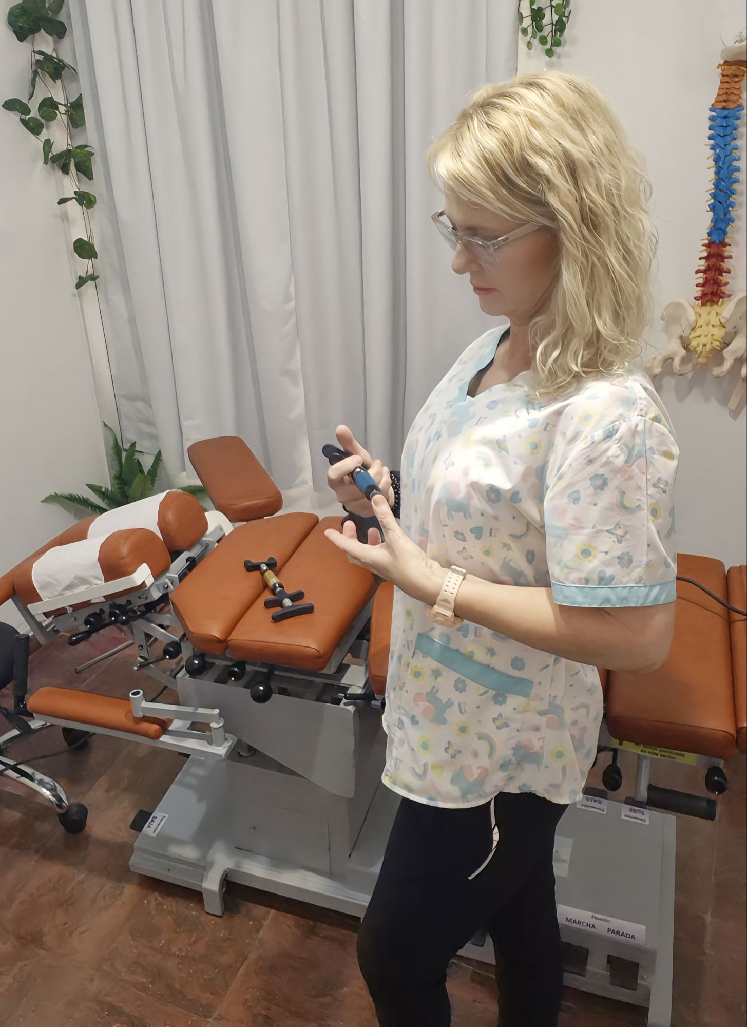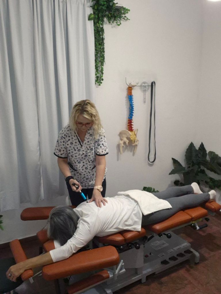 Además de las maniobras de terapia manual, se utiliza una camilla especializada con dispositivos aptos para la movilización de segmentos articulares, así como instrumentos quiroprácticos específicos que permiten realizar ajustes de forma controlada, segura y adaptada a las necesidades de cada paciente.